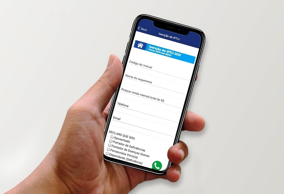 Para obter a isenção do IPTU 2021 através do aplicativo da Prefeitura (App Cajamar), o contribuinte deverá acessar a função “IPTU, ISS e Dívida Ativa”, em seguida preencher os dados cadastrais na aba “Isenção de IPTU”, anexar a foto dos documentos solicitados e concluir o procedimento clicando em ”enviar”. O formulário de solicitação para a isenção do IPTU também está disponível no site oficial da prefeitura: www.cajamar.sp.gov.br.