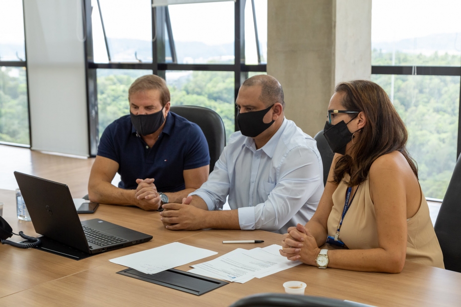 O prefeito de Santana de Parnaíba, Marcos Tonho, ao lado do deputado estadual Cezar e da secretária de Meio Ambiente, Veruska, participaram de uma audiência virtual com o diretor Metropolitano da Sabesp, Ricardo Borsari, para tratar de diversos assuntos, entre eles os trabalhos na rede de captação de detritos sólidos e líquidos no novo Centro Administrativo Bandeirantes, assim como o importante trabalho de proteção ambiental realizado no município que tem a maior reserva biológica urbana do Estado de São Paulo